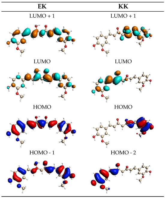 QM/FQ MOs involved in the vertical transitions of the EK (left) and KK (right) tautomers of curcumin computed for a representative snapshot.