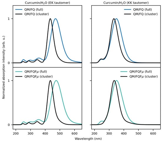As for CYD, solvent effects on curcumin EK and KK spectra are modeled using the polarizable QM/FQ and QM/FQF approaches. QM/MM calculations are performed on 200 uncorrelated snapshots extracted from MD runs. The number of uncorrelated frames guarantees the convergence of the computed spectra (see Figures S17 and S18 in the Supplementary Materials).