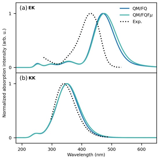 We now move to the comparison with the experimental spectra. EK and KK computed QM/FQ and QM/FQF spectra are reported in Figure 10, together with their corresponding experimental counterparts, which are recovered from ref. [98]. Both EK and KK experimental spectra are dominated by a single vertical transition placed at about 429 and 340 nm, respectively. Such a shift is probably due to the exploited choice of the DFT functional/basis set [98]. The broadening of both curves is almost homogeneous, reflecting the fact that vibronic couplings do not play a substantial role. In the case of EK (see Figure 10a), the experimental maximum lies at about 429 nm. The theoretical approaches predict a red-shifted maximum, which is placed at 471 and 475 nm for QM/FQ and QM/FQF methods, respectively. Although for EK the MD sampling predicts one main conformer to be populated (see Figure S19), the fluctuations around the equilibrium position are crucial to correctly accounting for conformational effects, as reflected by a very good reproduction of the band broadening. Such an inhomogeneous broadening cannot be obtained by exploiting an implicit, static QM/COSMO approach, which, however, provides absorption spectra in good agreement with the experiments (see Figure S20 in the Supplementary Materials). In the case of the KK tautomer (see Figure 10b), the QM/FQ and QM/FQF computed spectra are almost superimposed on the experiment. Our findings thus highlight that an excellent agreement with the experimental results can be achieved by accurately sampling the solute–solvent phase-space and by properly incorporating specific solute–solvent interactions, as well as mutual solute–solvent polarization effects.