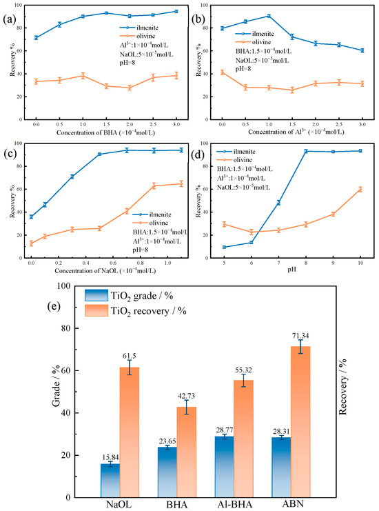 (a) The impact of BHA concentration on ilmenite and olivine recovery; (b) the influence of Al3+ concentration on ilmenite and olivine recovery; (c) the effect of NaOL concentration on ilmenite and olivine recovery; (d) the impact of pulp pH on ilmenite and olivine recovery; (e) flotation of artificial mixed minerals.