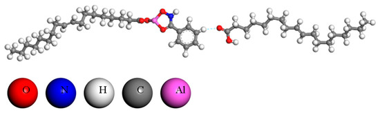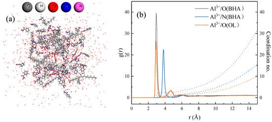 The self-assembly behavior of ABN ternary collectors in the liquid phase was analyzed using molecular dynamics simulation [31]. In the equilibrium configuration of the ABN aqueous solution simulated by dynamics, most OL molecules are entangled in clusters, with a small amount of BHA molecules free at the cluster’s edge. The majority of Al3+ ions are located inside the cluster, binding with OL or BHA. The spatial relationship between the components of ABN was further analyzed by calculating the radial distribution function (RDF) and coordination numbers of Al3+ with O (BHA), N (BHA), and O (OL). The results are presented in Figure 2.