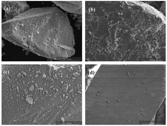 The surface morphology changes of ilmenite and olivine were analyzed using scanning electron microscopy [33,34], and the results are presented in Figure 5. The surface roughness of ilmenite and olivine samples remained similar after natural pH down-slurry treatment (Figure 5a,c). However, when ABN was added at pH = 8, the surface roughness of ilmenite increased, while that of olivine did not change significantly (Figure 5b,d). This difference may be attributed to the adsorption of metal hydroxides and ABN reagents on the ilmenite surface under weak alkaline conditions.
