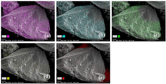 Elemental mapping of ilmenite: (a) Ti, (b) Fe, (c) O, (d) Al, (e) C.