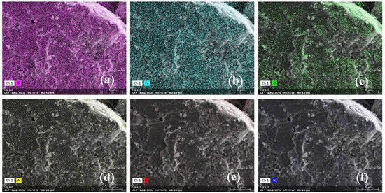 The analysis of surface elements in the samples revealed no significant difference in element distribution on the surface of the olivine sample before and after ABN treatment. Trace amounts of aluminum were detected on the surface of the ilmenite samples, likely due to natural weathering (Figure 6d). Following ABN treatment, the surface content of carbon and aluminum on ilmenite increased, and a small amount of nitrogen was detected, indicating that the ABN component was adsorbed onto the surface of the ilmenite samples (Figure 7d–f).