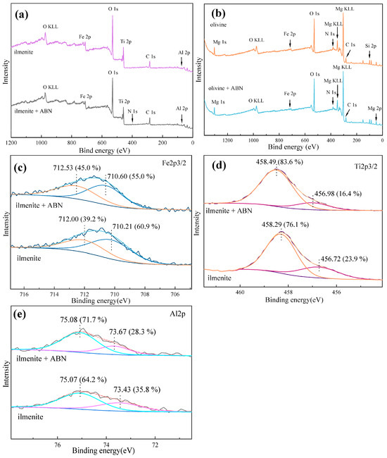 In order to further investigate the adsorption mechanism of ABN, high-resolution spectra of Ti 2p, Fe 2p, and Al 2p in different samples were analyzed (Figure 8c–e). Ilmenite exhibits two Fe 2p3/2 peaks at 710.21 eV and 712.00 eV, attributed to spin-orbit coupling where Fe 2p splits into Fe2+ and Fe3+ peaks [16]. Following treatment with ABN reagent, the two splitting peaks shifted by 0.39 eV and 0.53 eV, respectively, and the peak area ratio of Fe2+:Fe3+ changed from 60.8:39.2 to 55:45. This indicates a strong chemical reaction between ABN and the Fe site on the surface of ilmenite, leading to a more saturated state of the Fe site on the surface of ilmenite. The Ti 2p peaks of pure ilmenite samples split into two peaks at 456.72 eV and 458.29 eV, corresponding to Ti3+ and Ti4+, respectively. Upon ABN treatment, the two splitting peaks shifted by 0.26 eV and 0.2 eV, and the peak area ratio changed from 23.9:76.1 to 16.4:83.6. This indicates that ABN chemically adsorbs at the Ti site on the surface of ilmenite. DFT calculations predicted that Al served as the active center of the ABN reagent. Therefore, the high-resolution spectra of Al 2p on the surface of ilmenite before and after reagent treatment were examined (Figure 8d). The Al 2p orbital on the ilmenite surface splits into two peaks at 73.43 eV and 75.07 eV, corresponding to Al-OH and Al-O, respectively. After ABN treatment, the binding energy of the Al-OH peak shifted by 0.24 eV. The shift of the Al-O peak by 0.01 eV may be attributed to instrument error. The ratio of peak areas indicates a reduction in the hydroxide of Al from 35.87% to 28.3%. This suggests that the aluminum element in the Al-O state on the surface of ilmenite is already saturated, and the aluminum element in the adsorbed ABN component exists in the Al-O state, leading to an increase in the relative concentration of Al element but a decrease in the relative concentration of Al-OH.