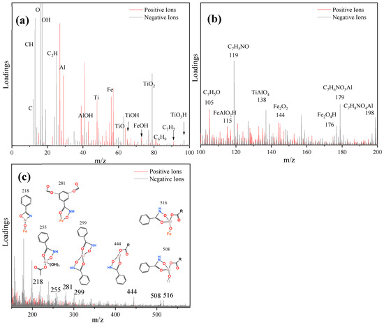 The different structural fragments of ABN on the surface of ilmenite were analyzed using TOF-SIMS mass spectrometry. The adsorption configuration of ABN on the ilmenite surface was visually analyzed [35,36]. The TOF-SIMS analysis results of ilmenite samples after ABN treatment are presented in Figure 8. Organic matter fragments were emitted as high-intensity secondary ions, with the fragment information forming a strong signal in the low-mass region (Figure 9a,b). The complex molecular ion exhibited characteristic signals in the 200–600 Da region (Figure 9c). Due to its large molecular weight and weak stability, the molecular ion signal was weak.