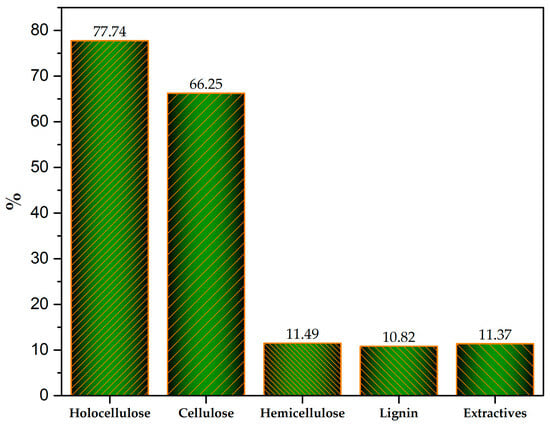 Holocellulose constitutes the total fraction of the polysaccharides present in wood, including cellulose (CE) and hemicelluloses (HMs) [16,17]. In this study, the sum of CE and HM resulted in a total of 77.74%, a percentage above those reported for other hardwoods in Mexico, which tend to fall between 63.8 and 73.58% [18,19]. It is important to clarify that the total content of the basic composition shown in Figure 2, practically 100%, is only the sum of EC, HMs, lignin, and extractables.
