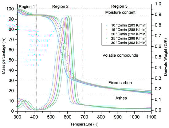 Three regions at distinct heating speeds are discernible in Figure 3 (β = 10–30 °C/min; 283–303 K/min). The first, located at temperatures between 300 and 415 K, can be identified with the loss of surface water from the biomass. As the graph advances, it presents the greatest loss of mass (≈60 %) in region 2 (415–680 K). For lignocellulosic materials, this zone is distinguished by the elimination of volatile materials, especially the two main polysaccharides: hemicellulose and cellulose. This is normally the area where the chemical reactions that decompose these compounds and the greatest generation of gases (methane, hydrogen, nitrogen, carbon monoxide and dioxide) occur, so it is called the active stage of pyrolysis. Finally, in the range of 680–1100 K, the degradation of lignin—the main cementing compound in these materials—occurs. Region 3 also reveals the formation of fixed carbon. In this stage, both curves (TGA and DTG) are practically flat.