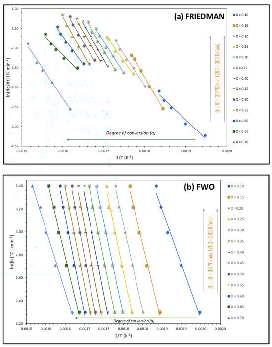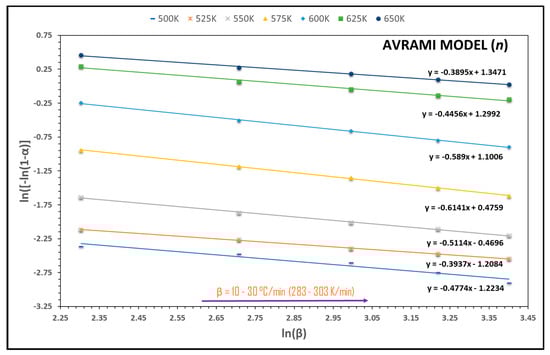 Another key parameter in kinetic analyses of thermogravimetric processes is the reaction order (n). The variation in this parameter for C. aesculifolia is shown in Figure 5 and Table 5. This was calculated using Avrami’s equation, as indicated in the Materials and Methods section. Calculating the reaction order requires considering the heating rate (β = 10–30 °C/min; 283–303 K/min) and the temperature range of 500–650 K for the most important event of pyrolysis (region 2)—that is, the TGA-DTG analysis. Clearly, according to the lines in Figure 5, the value of the lineal correlation coefficient (R2) lies between 0.95 and 0.99, with an average of 0.9903, which is acceptable for calculating the reaction order.