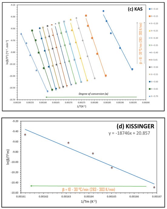 Regression lines to apparent activation energy proposed by Friedman (a), Flynn–Wall–Ozawa (FWO) (b), Kissinger–Akahira–Sunose (KAS) (c), and Kissinger (d) method free plots at the different heating rates for C. aesculifolia biomass.