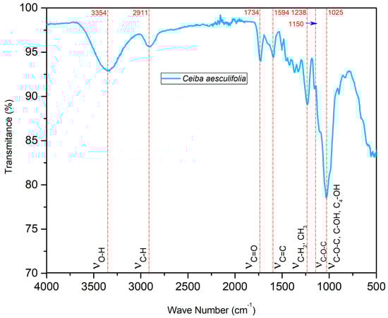 The FT-IR spectra of raw C. aesculifolia biomass are portrayed in Figure 6. There, we can identify the characteristic signals that correspond to the various functional groups that constitute the structure of wood, including polysaccharides, lignin, and other low-weight molecular compounds. The absorption band visible at 3354 cm−1 corresponds to the stretching vibrations of hydroxyl groups (OH) that are interlaced intermolecularly. These vibrations are related to the main constituents of wood, including cellulose, hemicellulose, lignin, and some proteins [75]. In another study, this functional group was reported for the bark of C. pentandra at 3418 cm−1 [96]. There are reports in the literature that this functional group is associated with the constitutional water present in the cell walls of wood [97]. Another functional group identified was CH, as has occurred with other species of this genus, like the bark of C. pentandra, where a similar signal to that of C. aesculifolia was observed at 2935 cm−1 [96]. According to the literature, the signal at 2911 cm−1 is associated with symmetric and non-symmetric vibrations, suggesting the presence of groups of aliphatic chains (CH2, CH3) derived from the elemental structure of the raw material, such as cellulose, hemicellulose, and lignin [98]. The CH functional group has been found in other studies of hardwood species in the range of 2938–2933 cm−1 [99]. Likewise, for species of this genus, there are reports of a vibration in the region around 2918 cm−1 in the cellulose of the fruit of C. pentandra [100]. Published reports also affirm that the bands centered around 2911 cm−1 have been associated with extractable substances located on the surface of the primary cell wall. A study of C. aesculifolia seeds found these kinds of substances at 2918 cm−1, while another found them in C. speciosa fruit (also a member of this genus). In that case, the signals at 2900 cm−1 were attributed to lipids [101,102].