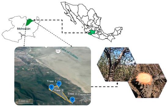 As Figure 7 shows, the C. aesculifolia waste analyzed was collected in the Lake Cuitzeo basin in the state of Michoacán, Mexico (coordinates in Table 7). Three trees were selected, and 10 cm wide slices were cut at a height of 1.30 m (DAP: diameter at the height of the chest). We then separated the wood and bark of the slices. The wood was splintered manually and left to dry in the shade until it reached moisture equilibrium (approximately 12%). After drying, the splinters were pulverized in a mill (Model K20F, series 236, Micron S.A. de C.V., Mexico City). Finally, the pulverized material was sifted in a Ro-Tap machine (Model RX-29, W.S. Tyler, Mentor, OH, USA), utilizing meshes of 20, 40, and 60. The material from flour mesh 40 (425 µm) was used for the chemical, energy, and thermal characterizations (TGA-DTG) and thermodynamic analysis.