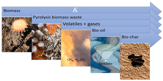 - Xu, Y.; Chen, B. Investigation of thermodynamic parameters in the pyrolysis conversion of biomass and manure to biochars using thermogravimetric analysis. Bioresour. Technol. 2013, 146, 485–493. [Google Scholar] [CrossRef]