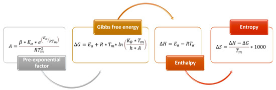 Similar results have been reported where A varied from 107 to 1012 s−1—for example, with red pepper, rice husk, and bran [80]. Other reports affirm that, depending on whether the value of A is <109 s−1 or ≥109 s−1, either collisions or superficial reactions and the formation of a simple compound will occur, respectively. However, if this value lies between 1010 and 1012 s−1, there is a possibility of activating rotations of certain compounds that were passive at first [81]. This may cause the size of the complex formed to increase (unimolecular reaction) or remain unchanged (monomolecular reaction) in relation to the interaction with its neighbors [82]. In this case, regardless of the method applied, the constant values of the pre-exponential factor (1010–1011 s−1) represent the zone where the main loss of mass occurs—that is, degradation of HM and CE when the degree of advance (α) lies between 0.40 and 0.55 throughout the pyrolytic process. The highest value for A (3.47E + 11 s−1) was calculated by Kissinger’s method, perhaps reflecting the fact that the rotation of the active–reactive compound pair remained unchanged during the thermal process [83]. However, in light of the disparity with the results of the Friedman, FWO, and KAS methods, it is likely that Kissinger’s method presented this result because of the method’s mathematical basis, as explained previously.