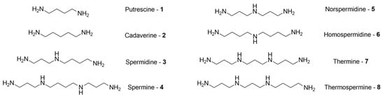 In vertebrates, two oligoamines, spermidine (3) and spermine (4), are present along with their precursor, the diamine putrescine (1). The absence of a normal oligoamine content can have a significant impact on cell functions including differentiation, apoptosis, motility, and resistance to oxidative and other stresses [,]. The importance of these oligoamines is shown not only in the effects of their absence but also in their extensive spectrum of applications. It has been shown that elevated spermine (4) levels can be used to indicate the presence of cancer cells, making it possible to use spermine (4) as a cancer biomarker []. Furthermore, the high concentration of spermine (4) and spermidine (3) can also be connected to psoriasis, where patients have about 5.5 times the amount of these oligoamines than healthy people []. On the other hand, concentrations below the normal amount can be linked to aging related illnesses, such as Parkinson’s disease []. Studies have also shown that spermidine (3) holds promise for both diagnosis and treatment of ocular diseases [].