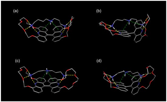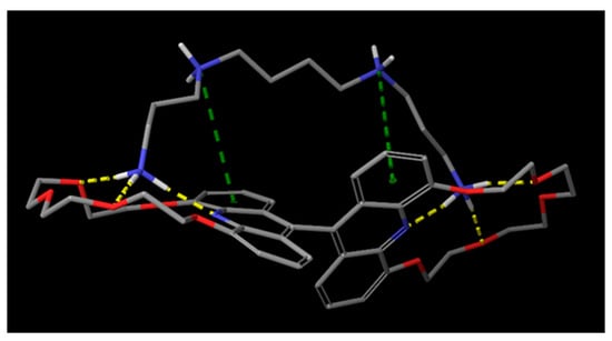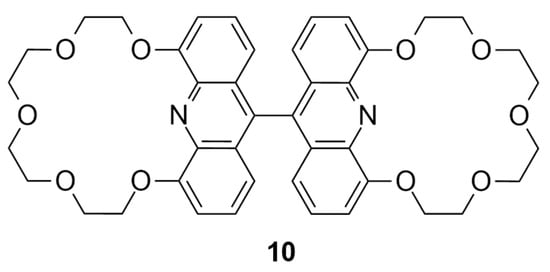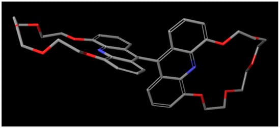 In its minimal energy state, host molecule 10 assumes a fully extended conformation (Figure 4). The planarity of the acridine units is undisrupted and the centers of the crown ether macrorings stay in the proximity of the aromatic planes. The bond connecting the acridine units falls into both aromatic planes; therefore, bending cannot be observed between the two rings. The equilibrium conformation determined in the modeling of host molecule 10 closely aligns with the observed conformation of biacridines [], with an angle of approximately 80 degrees between the planes of the two acridine units.