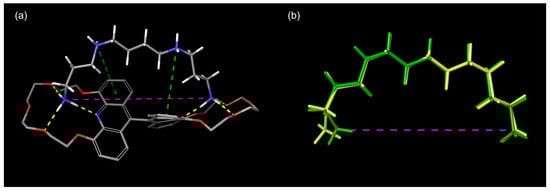 The distance between the terminal amines of spermine in complex with compound 10 indicated as purple dashed line: (a); overlay of the conformation of spermine bound to the host molecule 10 (yellow) and a local minimum energy state of spermine obtained using the “MacroModel Minimization” function of Schrödinger (green): (b).