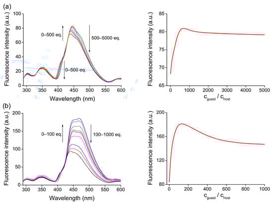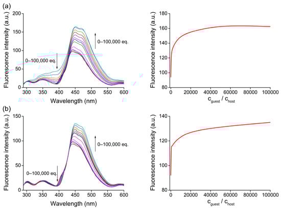 Series of fluorescence emission spectra for titration of 10 with triamines (left) and the corresponding global nonlinear regression curve on fluorescence emission data-series as a function of the concentration of guest molecules (right) [(a) norspermidine (5); (b) spermidine (3)].