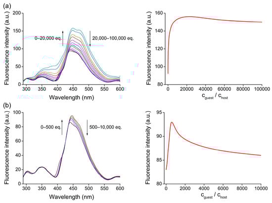 where the ratios of k parameters and K were left as floating parameters during the fitting method. Parameters F and F0 are wavelength-dependent variables and [G] was set as a variable, too. F0 refers to the initial fluorescence intensity of the free host molecule, kH is a constant referring to the optical properties of the free host molecule, is a constant referring to the optical properties of the free host in the presence of preferred guest molecules, constant kHG describes the photophysical features of the complex, K is the association constant, and [G] is the concentration of the initial guest molecules.