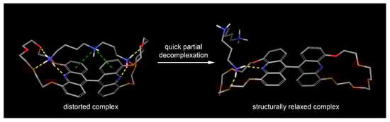 The latter phenomenon cannot take place regarding the shorter-chain amines, because the double-inclusion complexation in the case of the initial 1:1 stoichiometry causes a conformational distortion of the structure of the host molecule moving the crown ether rings slightly toward each other. This results in a reduced kinetic stability of the complex, which is also supported by the modeling (Figure 13).