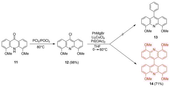 The chloro-acridine derivative (12) was then subjected to a Kharasch type cross-coupling reaction with dilithium tetrachlorocuprate and palladium acetate as catalysts, in the presence of phenylmagnesium bromide, where the intended product was 9-phenyl derivative 13 (Scheme 1).