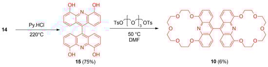 Although the expected product could not be obtained, byproduct 4,4′,5,5′-tetramethoxy-9,9′-biacridine (14) was isolated with a good yield (71%). After identifying this byproduct, we determined that it would be used for the synthesis of macrocycle 10 (Scheme 2). The methyl groups of 14 were cleaved with pyridinium chloride to obtain tetrahydroxy-biacridine 15. Macrocyclization of 15 with tetraethylene glycol ditosylate was carried out in DMF using potassium carbonate as a base to produce 10. Bismacrocycle 10 was isolated with a low yield (6%), which is typical for these types of reactions, especially in this case where the macrocycle rings can be closed in several ways. The primary byproducts include compounds where the ditosylate reacted with hydroxyl groups on two different acridine subunits of the biacridine, as well as partially reacted compounds where only one ring has closed. Other minor byproducts include compounds where the ditosylate reacted with only one hydroxyl group, as well as those where the ditosylate reacted with hydroxyl groups on two different biacridine molecules, leading to no macrocyclic ring formation.