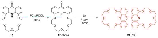 Another method for the synthesis of macrocycle 10 is outlined in Scheme 3, where the starting material was a reported acridono-crown ether (16) []. Crown ether 16 reacted with phosphorus pentachloride in phosphoryl chloride resulting in chloroacridino-crown ether 17, which is reported as an unstable compound and has not been isolated or characterized before []. Chloroacridino-crown ether 17 was converted to macrocycle 10 by a coupling reaction using zinc powder in tert-butylbenzene giving a 7% yield.