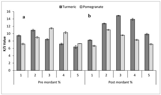 | Mordant | Mordant Ratio % | Turmeric | Pomegranate Peel | ||||