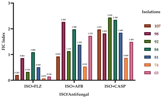 Effect of ISO in combination with FLZ, AFB and CASP against C. tropicalis. The fractional inhibitory concentration indices (FICIs) of the different clinical isolates of C. tropicalis are shown.
