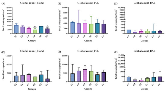 Global leukocyte count, acute phase (A–C) and chronic phase (D–F). (A) Acute phase: blood; (B) acute phase: PCL; (C) acute phase: BAL; (D) chronic phase: blood; (E) chronic phase: PCL; (F) chronic phase: BAL. Groups: G1: CTRL + water; G2: CTRL + oil; G3–G6: 25, 50, 100 and 200 mg/mL of ISO at 14 days. (*) vs. G1: *** p ≤ 0.001; **** p ≤ 0.0001. (°) vs. G2: ° p ≤ 0.05, °°° p ≤ 0.0001. The results are presented with the mean and standard deviation (A,E). The results are presented as the median with the upper and lower quartiles: Me [Q1; Q3] (B–D,F).