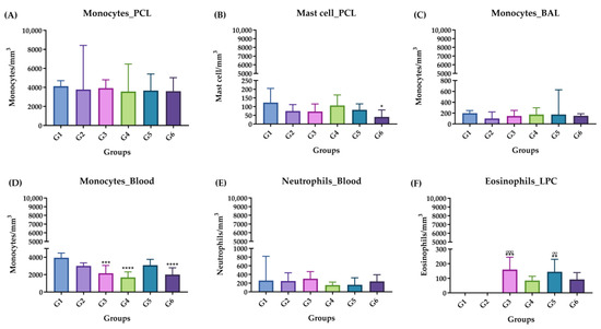 Differential leukocyte count, acute phase. (A) Monocytes in PCL. (B) Mast cells in PCL. (C) Monocytes in BAL. (D) Monocytes in blood. (E) Neutrophils in blood. (F) Eosinophils in blood. Groups: G1: CTRL + water; G2: CTRL + oil; G3–G6: 25, 50, 100 and 200 mg/mL of ISO after 14 days. (*) vs. G1: * p ≤ 0.05; ** p ≤ 0.01; *** p ≤ 0.001; **** p ≤ 0.0001. (°) vs. G2: °° p ≤ 0.01; °°° p ≤ 0.001. The results are presented with the mean and standard deviation (B,D). The results are presented as the median with the upper and lower quartiles: Me [Q1; P3] (A,C,E,F).