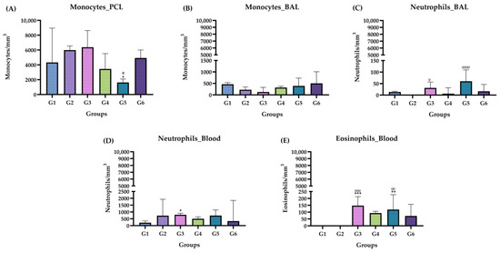 Differential leukocyte count, chronic phase. (A) Monocytes in PCL. (B) Monocytes in BAL (C) Neutrophils in BAL. (D) Neutrophils in blood. (E) Eosinophils in the blood. Groups: G1: CTRL + water; G2: CTRL + oil; G3–G6: 25, 50, 100 and 200 mg/mL of the ISO at 90 days. (*) vs. G1: * p ≤ 0.05; ** p ≤ 0.01; *** p ≤ 0.001. (°) vs. G2: ° p ≤ 0.05; °° p ≤ 0.01; °°° p ≤ 0.001, °°°° p ≤ 0.0001. The results are presented with the mean and standard deviation (B,D). The results are presented as the median with the upper and lower quartiles: Me [Q1; P3] (A–E).