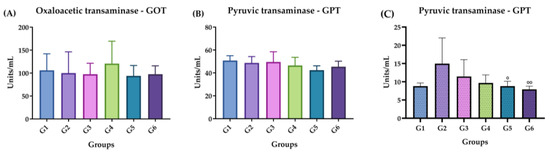 Figure 5 shows the doses of hepatic transaminases, oxaloacetic transaminase (GOT) and pyruvic transaminase (GPT) in the plasma of the animals after inoculation with ISO in the acute (Figure 5A,B) and chronic phases (Figure 5C). There was no increase or significant difference in the amounts of GOT or GPT in the groups exposed to the compound compared with the control group in the acute phase. In the chronic phase, GPT levels significantly decreased in G4 and G5 compared with G2 (Figure 5C). There was no GOT expression.