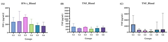 The concentrations of IFN-γ and TNF (in pg/mL) were only detected in the plasma, BAL and PCL of each animal in blood in both the acute and chronic phases, as shown in Figure 6. In the acute phase (Figure 6A,B), no statistically significant values were detected when G3, G4, G5 and G6 were compared with controls G1 and G2. In the chronic phase (Figure 6C), no positive cytokine levels (in pg/mL) were detected.