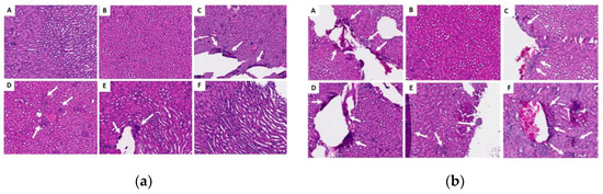 Histological sections of the kidneys in the acute (a) and chronic (b) phases. (A) Control G1 (water); (B) control G2 (oil); (C) G3 (25 mg/kg); (D) G4 (50 mg/kg); (E) G5 (100 mg/kg) and (F) G6 (200 mg/kg). The white arrows indicate areas of lymphoplasmacytic infiltrates; there were no changes in the groups represented by images (A), (B) or (F) in the chronic phase.