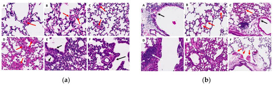Histological sections of the lungs in the acute (a) and chronic (b) phases. (A) Control G1 (water); (B) control G2 (oil); (C) G3 (25 mg/kg); (D) G4 (50 mg/kg); (E) G5 (100 mg/kg) and (F) G6 (200 mg/kg). Red arrows indicate foci of hemorrhage; white arrows show areas of lymphoplasmacytic infiltrates; and black arrows represent thickening in the alveolar septa.
