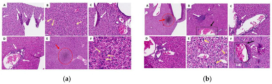 Histological sections of the liver in the acute (a) and chronic (b) phases. (A) Control G1 (water); (B) control G2 (oil); (C) G3 (25 mg/kg); (D) G4 (50 mg/kg); (E) G5 (100 mg/kg) and (F) G6 (200 mg/kg). White arrows indicate areas of lymphoplasmacytic infiltrates; yellow arrows indicate the presence of binucleated hepatocytes (a sign of regeneration); red marks refer to discrete foci of necrosis and black marks represent areas of granuloma.
