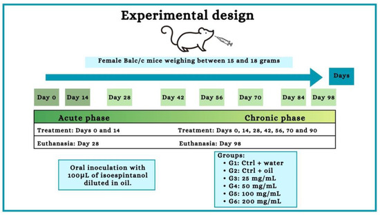 As shown in the experiment design (Figure 10), six experimental groups were established; all animals were weighed (between 15 and 18 g) and randomly distributed. Each group received oral treatment with a final volume of 100 μL. In the acute phase experiments, 55 animals were used (10 for each ISO group, 7 for the water control and 8 for the oil control); the treatment was carried out every 14 days, occurring on days 0 and 14. In the chronic phase, 55 animals were used (10 for each ISO group, 7 for the water control and 8 for the oil control); the treatment was carried out on days 0, 14, 28, 42, 56, 70 and 84.