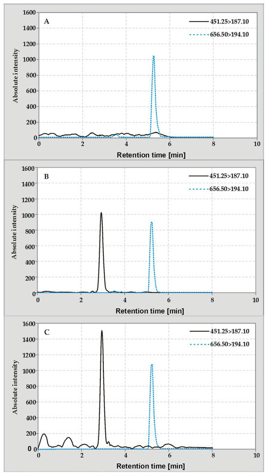 Figure 1 compares exemplary APCI(+)-MRM chromatograms obtained for the blank sample and the above-mentioned iceberg lettuce extracts obtained after the PLE and UASE procedures. Each sample was enriched with a deuterium derivative of vitamin K2MK-7-D7. Due to the lack of commercially available blank and control samples, a representative sample of iceberg lettuce was used in the experiments in which the endogenous vitamin K1 was destroyed by irradiation (chromatogram A). A detailed description of obtaining the blank sample together with a description of the validation experiments is presented in Section 3.4.
