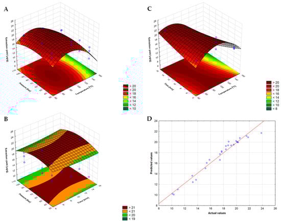 The 3D surface plots shown in Figure 2 allow for a more understandable comparison of the interaction effects of independent and dependent variables. These graphs were obtained by changing the values of two independent variables, keeping the third variable constant and predicting the efficiency of vitamin K1 extraction from iceberg lettuce. Thus, the influence of temperature and pressure during the 10-min extraction time is shown in Figure 2A; the effect of extraction time and pressure at 85 °C is presented in Figure 2B; and the influence of time and temperature on the extraction efficiency at a pressure of 66 bar is shown in Figure 2C. Figure 2D shows a graph of the values predicted by the developed model as a function of the actual vitamin K1 extraction efficiency.