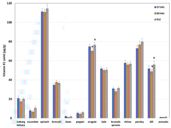 The results of this series of studies are presented in Figure 3. Their analysis shows that the content of vitamin K1 in the plants tested is very diverse. In general, the highest content of this analyte was found in spinach, which is consistent with the literature data [27,29]. Nevertheless, high vitamin K1 content is also characteristic of arugula, parsley, chives, dill, and kale, respectively. The smallest amounts were found in broad beans and avocado. In the case of the vast majority of vegetables and fruits tested, the differences in the results obtained using the UASE technique at two ultrasound frequencies and the PLE technique are statistically insignificant. This confirms the accuracy of the vitamin K1 determination in the plants tested. Only in the case of arugula and dill is the efficiency of PLE statistically significantly higher than the efficiency of vitamin K1 extraction using the UASE technique at a frequency of 80 kHz. It is worth recalling here that the PLE extraction time is more than twice shorter than the UASE time. Vitamin K1 in the plant matrix may interact with other matrix components and it is likely that the higher temperature of the PLE process favors the release of this analyte from stronger interactions, which may explain the lower efficiency of the UASE extraction carried out at lower temperatures; however, confirmation of this assumption requires another series of experiments. The literature data showing a higher yield of vitamin K1 from spinach subjected to prior heat treatment, in comparison with the yield of the analyte from raw spinach, may indirectly confirm the validity of the above assumption [27]. A similar situation occurs in the case of the isolation of carotenoids from plants [29,30]. However, it should be remembered that the amount of the compound extracted from the plant material is the result of two opposing processes occurring in parallel, i.e., extraction and degradation of the analyte under the influence of temperature.