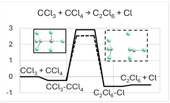 Energy diagram (in eV) for the CCl3 + CCl4 → C2Cl6 + Cl reaction. The reactions can be led by a C-C bond forming (solid line) or a C-Cl bond breaking (dashed), as described in the text, with the corresponding transition states shown in matching frames.