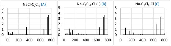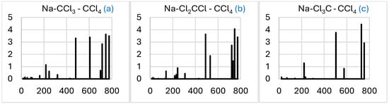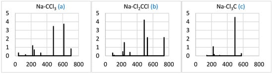 Simulated IR spectra (intensity in (D/Å)2 vs. frequency in cm–1) of the Na-CCl3 (a), Na-Cl2CCl (b), and Na-Cl3C (c) complexes. Letters of systems correspond to those in Figure 3. The spectral data can be found in Table S1 (in the Supplementary Materials).