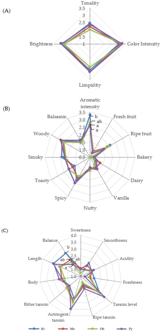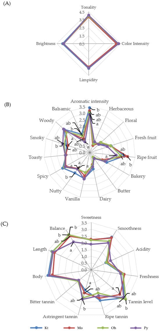 Visual (A), olfactory (B), and gustatory (C) phases of sensory analysis of Tempranillo wines aged for 24 months in oak barrels from Kentucky (Kt), Missouri (Mo), Ohio (Oh), and Pennsylvania (Py). Different letters on the same line indicate statistically significant differences (p < 0.05).