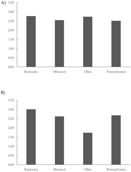 Preference sensory test of Tempranillo wines aged for 12 months (A) and 24 months (B) in oak barrels from Kentucky, Missouri, Ohio, and Pennsylvania.