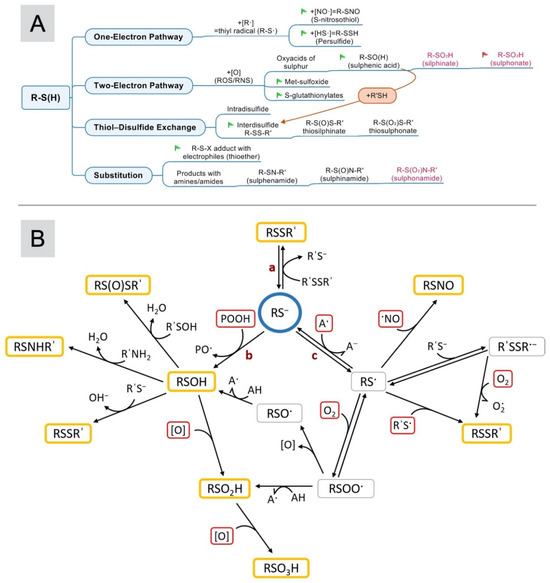 (A) The complete scheme of reactions that generate oxidation products of thiols in biological systems. The green flags indicate reversible reactions, and the red flag indicates an irreversible reaction. Text highlighted in fuchsia refers to products that may not occur in biological objects. (B) The oxidation of the thiol group of albumin [25]. The blue and red frames contain the reagents, and the yellow structures include the products. Adapted with permission from [25]. Copyright 2024, Elsevier.