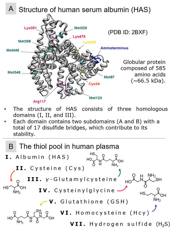 A notable blood participant in redox homeostasis is human serum albumin (HSA, M = 66,348 Da) (refer to Figure 2A), with an average plasma content ranging from 35 to 52 g/L (ca. 525–780 µM) [87]. At neutral pH, this functional group is protonated (with an approximate pKa value of 8) [25]. When the sulfhydryl group of albumin is protonated, it is referred to as mercaptoalbumin. Thiol species in blood plasma are depicted in Figure 2A.