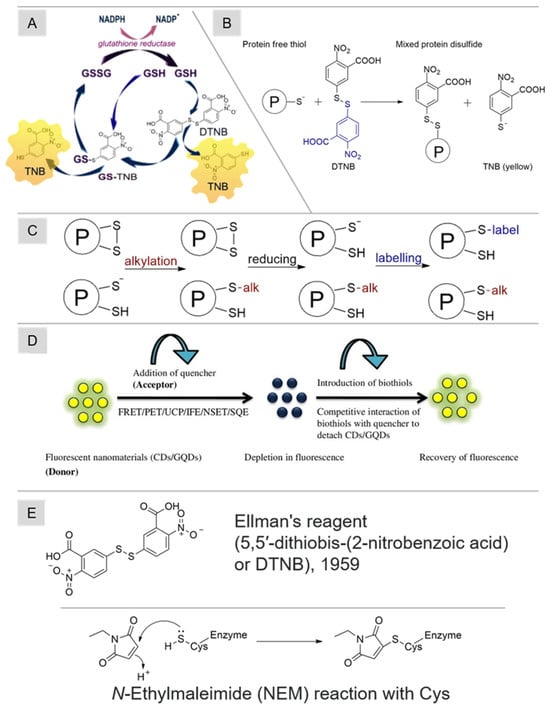 (A) The scheme of reactions for the determination of thiols using Ellman’s reagent [33], (B) the determination of free reduced thiols with Ellman’s reagent [27], (C) a general approach to thiol speciation by monitoring the reversible oxidation of protein thiols based on tags [27], (D) the mechanism of thiol detection using fluorescent carbon nanosensors [29], and (E) the chemical formulae of DNTB and NEM, as well as the reaction scheme of NEM with Cys. Adapted with permission from [27,29,33]. Copyright 2024, Elsevier.