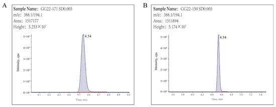 QuEChERS pretreatment has become the preferred method for determining pesticide residues in food. In this study, a modified QuEChERS method was used to extract pyraclostrobin from apples, using 2% ammonia and acetonitrile as the extraction solvent, followed by sodium chloride (NaCl) salting out, PSA and GCB dispersive solid phase extraction cleanup, and finally ultra-high performance liquid chromatography–mass spectrometry (UHPLC–MS/MS) detection. As in our study, Li et al. used a modified QuEChERS method to extract pyraclostrobin, methyl thiophanate, carbendazim, and tebuconazole from apples []. As shown in Figure 2, pyraclostrobin was well separated, with a retention time of 4.54 min. The linearity, sensitivity, precision, accuracy, and matrix effect (ME) of the established method were verified according to the guidelines on pesticide residue trials (NY/T 788-2018) [] and the European Union SANTE guidelines (SANTE/11312/2021) [].