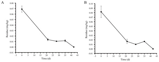 Harvest intervals of 28 and 35 days were designed to monitor terminal residues of pyraclostrobin and recommend pre-harvest intervals (PHIs) for commercial formulations applied in apples. As shown in Table 3, at PHIs of 28 and 35 days, the terminal residues of pyraclostrobin in apples were <0.010–0.070 mg kg−1 and <0.010–0.048 mg kg−1, which were lower than the MRL (0.5 mg kg−1) recommended by China []. Therefore, according to the maximum recommended dosage of 73.75 mg kg−1 for spraying, 59 g L−1 pyraclostrobin dispersed oil suspension should be applied three times with an interval of 7 days between applications, and the recommended PHI is 28 days. These data can provide a reference for the rational use of pyraclostrobin in apples.
